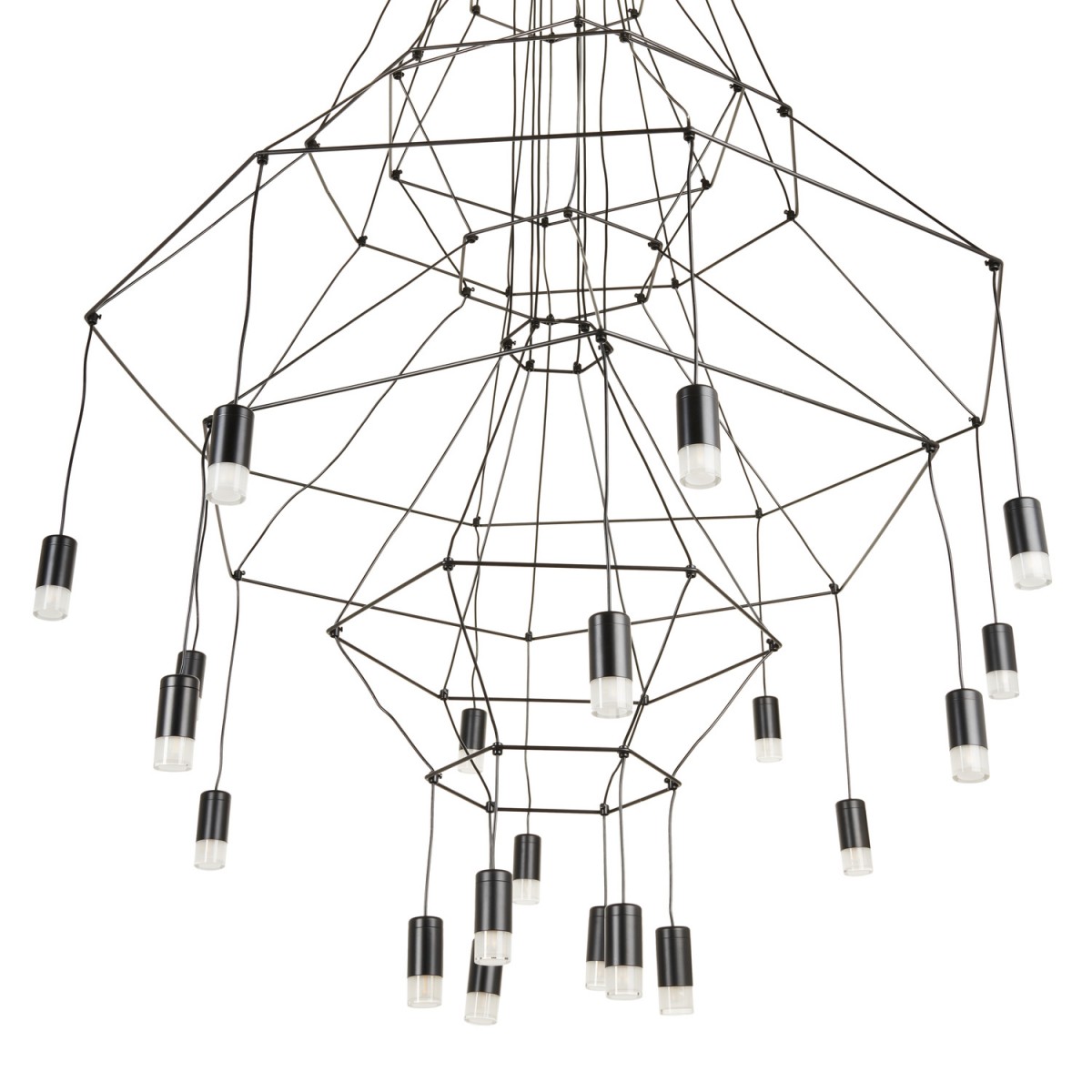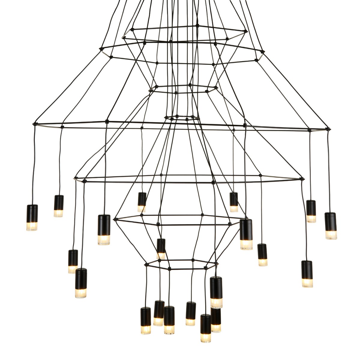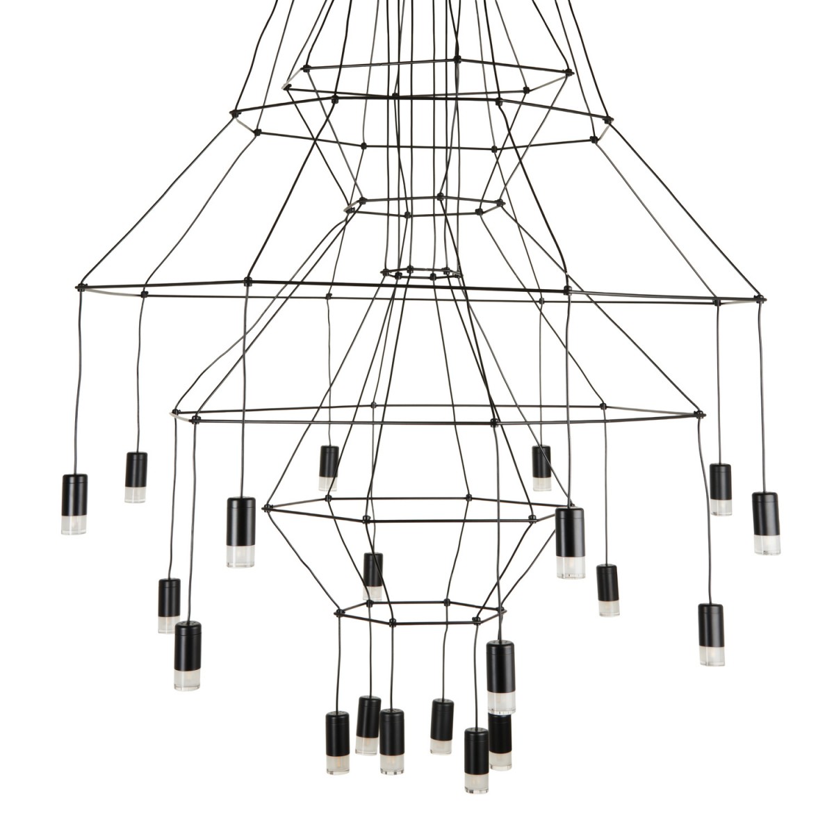 Lampa LINEA 20 o geometrycznej konstrukcji, idealna do wysokich wnętrz. Czarne, cienkie pręty tworzą wielopoziomową, przestrzenną formę, która nadaje lampie industrialny i minimalistyczny charakter.