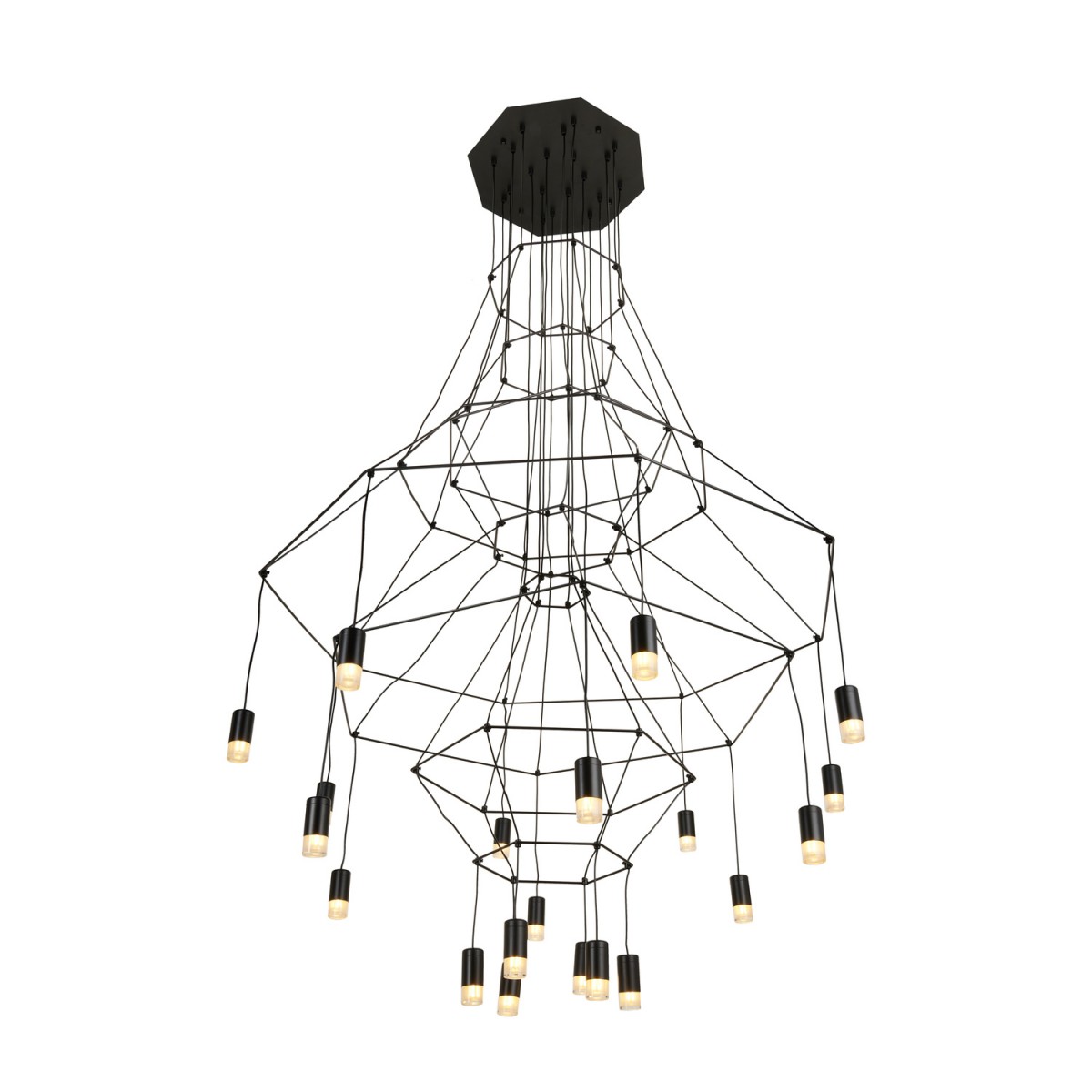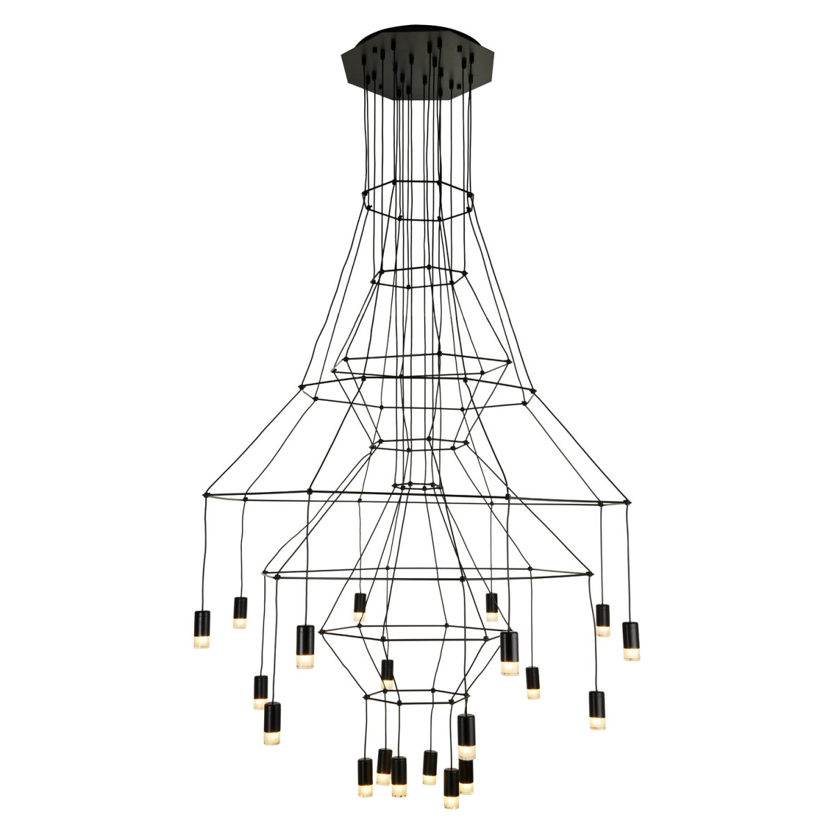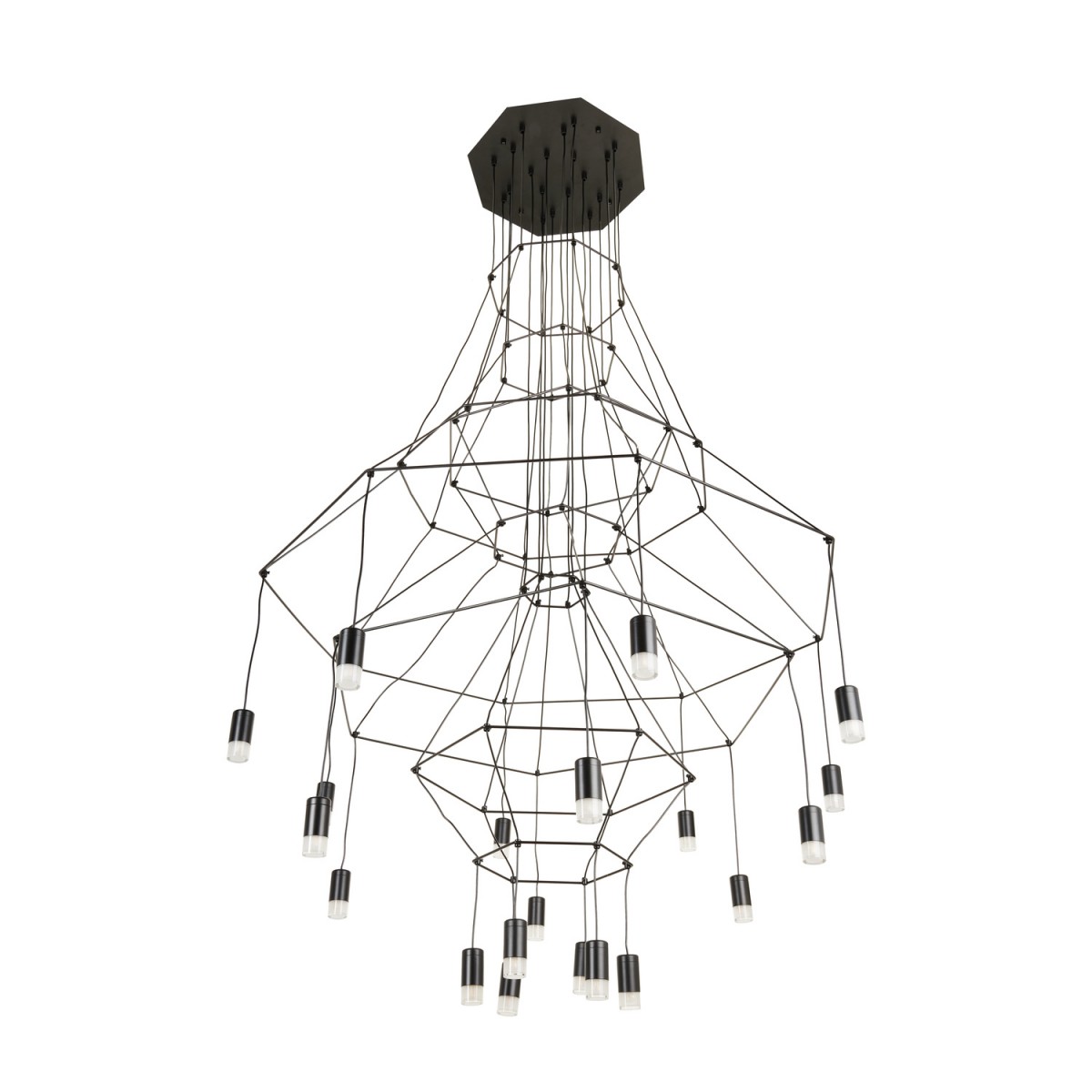 Lampa LINEA 20 o geometrycznej konstrukcji, idealna do wysokich wnętrz. Czarne, cienkie pręty tworzą wielopoziomową, przestrzenną formę, która nadaje lampie industrialny i minimalistyczny charakter.
