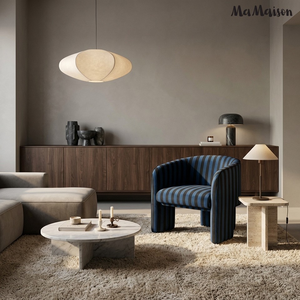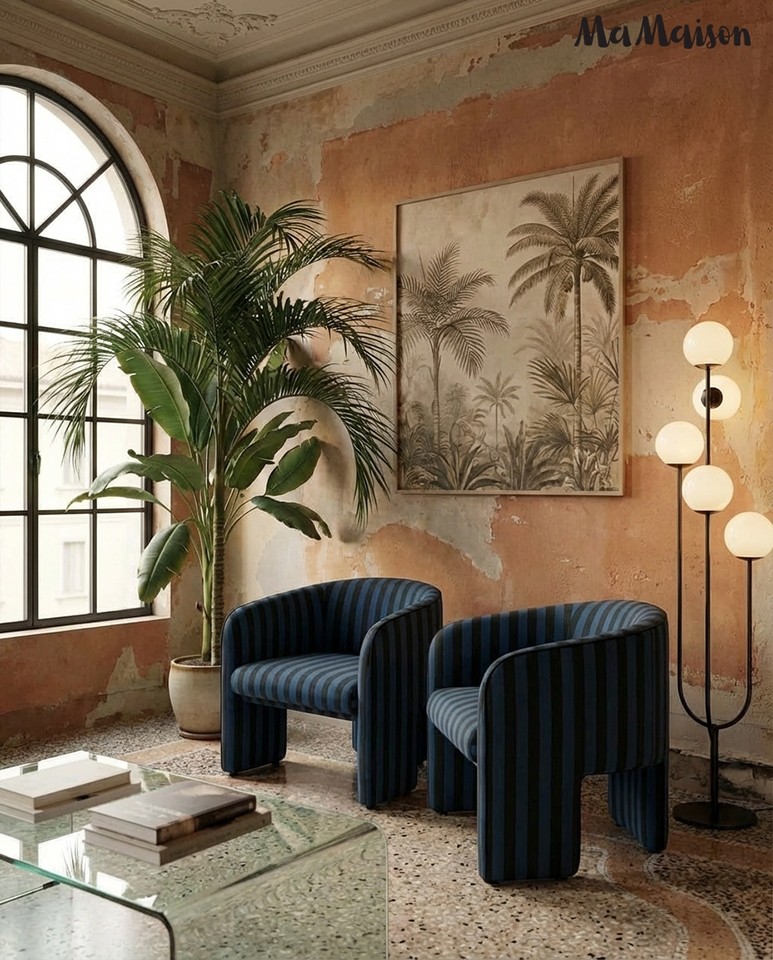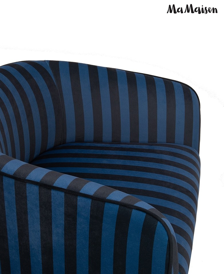 Fotel w głębokim odcieniu granatu i czerni zachwyca wyrazistym, pasowym wzorem, który nadaje mu designerskiego charakteru.